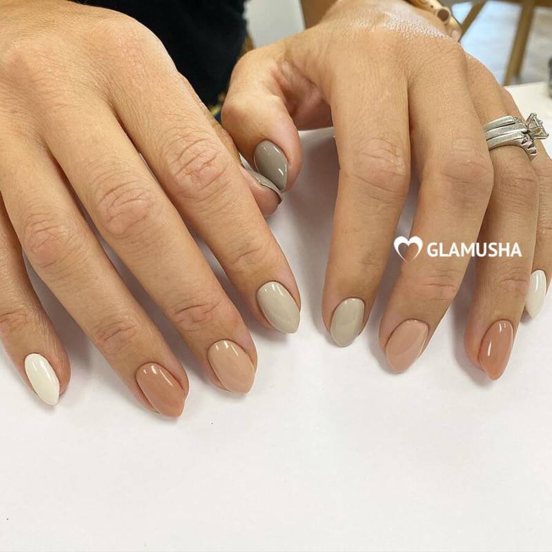 Оттенок лака чуть-чуть светлее вашего оттенка кожи, но при этом сильного контраста нет. микс различных оттенков. Вовсе не обязательно использовать только один оттенок при покрытии. Вы можете подобрать несколько оттенков и наносить их поочередно или хаотически. При таком нанесении можно использовать до 5 различных оттенков. Отлично сочетаются оттенки розового и коричневого. нюд камуфляж. Еще один способ сделать очень мягкий акцент на своих руках. Используем оттенки розового, хаки и коричневого. мокка и золото. Необычный вариант покрытия, который смотрится празднично и нарядно, но при этом не утрачивает своей сдержанности и элегантности. Основа такого маникюра — это, конечно, мокка. Золото добавляем совсем немного золота на кончиках ногтей. При таком сочетании вам может и не понадобятся дополнительные украшения на руки или пальцы. Одного кольца вполне достаточно, чтобы получить прекрасный и завершенный образ. нюд и лаванда. Еще один интересный вариант для покрытия, если хочется чего-нибудь оригинального. Сам по себе лавандовый оттенок довольно яркий, даже если взять самые приглушенные оттенки. А вот добавить немного лаванды к бежевому нюду — это идеально. Можно сделать любой небольшой лавандовый акцент на ногтях. нюд и минимализм. Тренд этого сезона — простота и лаконичность. Если уж добавляете узоры и геометрические фигуры, то не переусердствуйте. Всего должно быть в меру