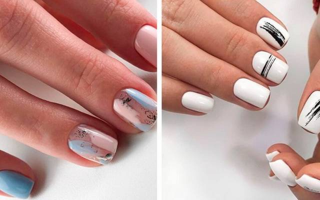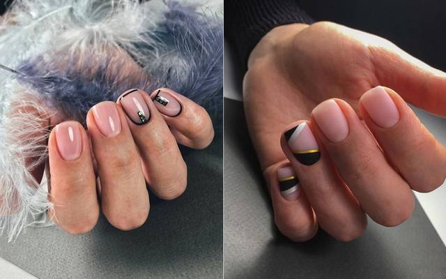Черно-белые детали. Здесь нужно вспомнить «негативное пространство», при котором прозрачные ногти дополняются тонкими линиями черного и белого цветов, а также рамочный маникюр.