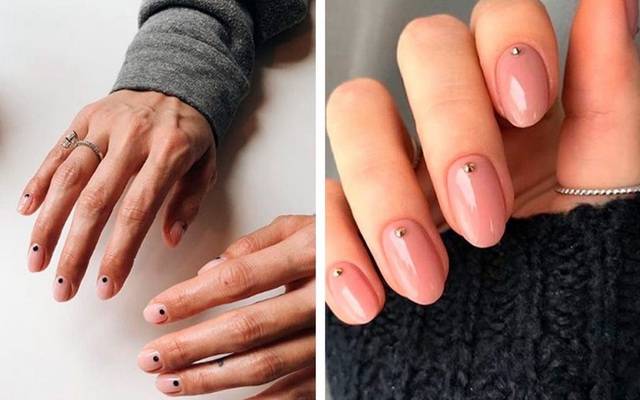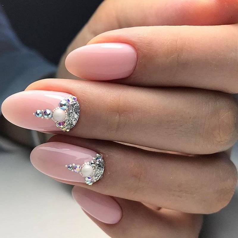 Мелкие стразы. Используйте в качестве фона нюдовый или пастельный оттенок, а в качестве декора – крошечные стразы или блестки, которые можно расположить по краю ногтевой пластины, у основания или в хаотичном порядке.