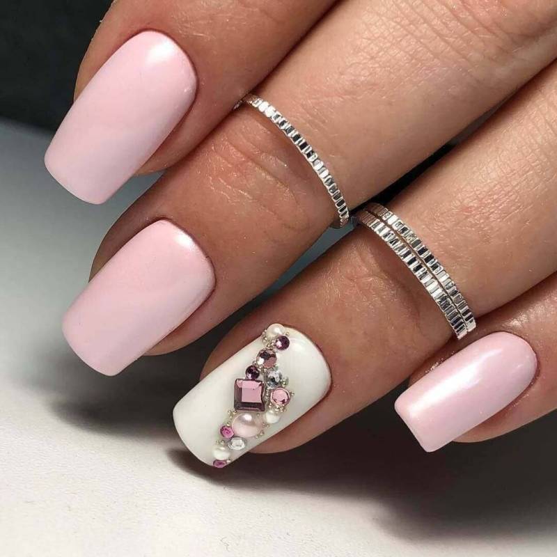 В этом варианте маникюра стразы используются как яркий акцент на одном или нескольких ногтях. Можно выбрать стразы разного размера, формы и цвета, чтобы создать интересный и запоминающийся дизайн. Один или несколько страз на акцентном ногтевом лаке могут сделать маникюр особенным и стильным.