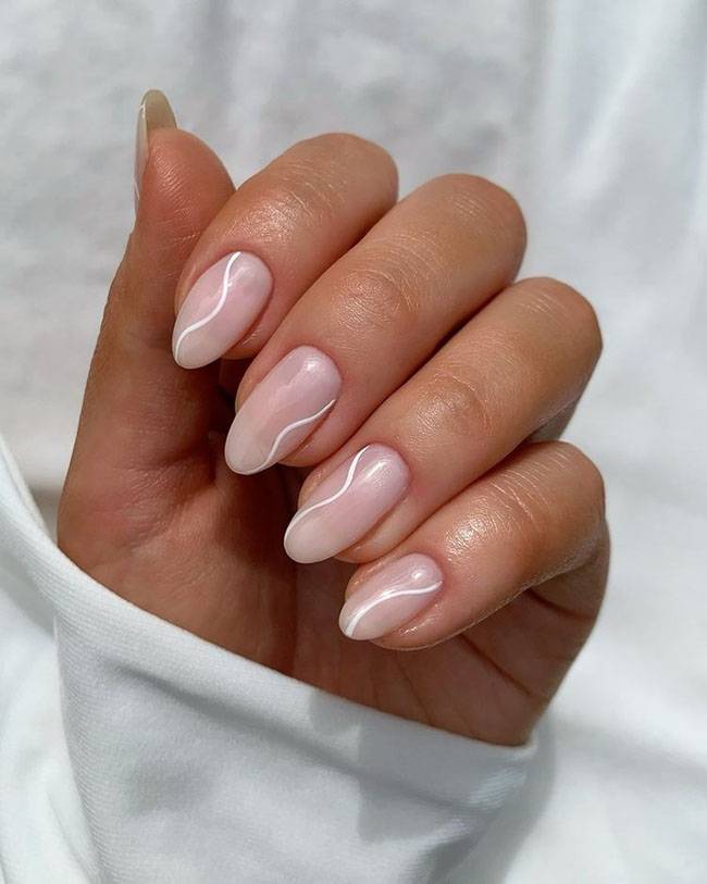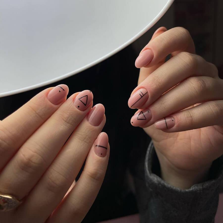 Минимализм. Ногти естественного оттенка с тонкими линиями, крошечными завитками и точками – оригинально и сдержано. Огромный плюс такого решения – ноготь отрастает незаметно, можно отложить коррекцию на несколько дней.