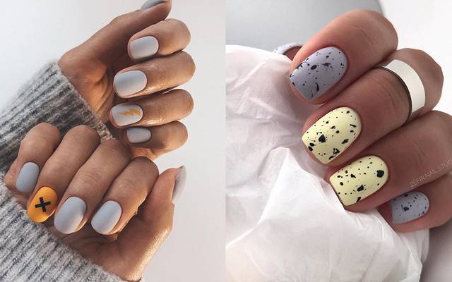 Актуально будет добавить рисунки геометрических фигур, птичек или белый горошек. Невероятно красивый дизайн можно получить, если покрыть все ногти матовым лаком, а на безымянный палец и мизинец нанести блестки. Такое оформление ноготков сегодня можно часто увидеть на фото голливудских звезд.