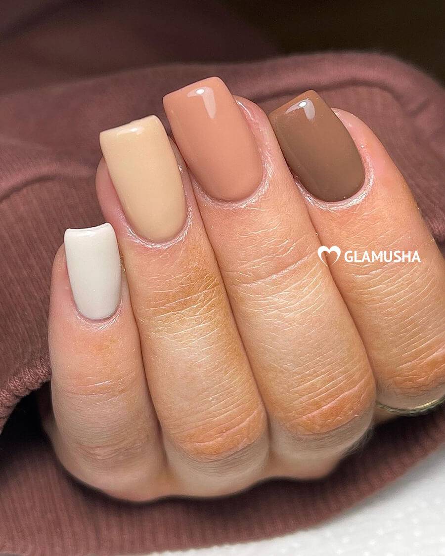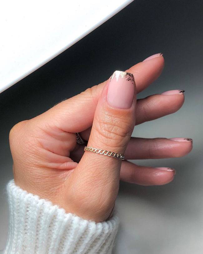 Оттенок лака чуть-чуть светлее вашего оттенка кожи, но при этом сильного контраста нет. микс различных оттенков. Вовсе не обязательно использовать только один оттенок при покрытии. Вы можете подобрать несколько оттенков и наносить их поочередно или хаотически. При таком нанесении можно использовать до 5 различных оттенков. Отлично сочетаются оттенки розового и коричневого. нюд камуфляж. Еще один способ сделать очень мягкий акцент на своих руках. Используем оттенки розового, хаки и коричневого. мокка и золото. Необычный вариант покрытия, который смотрится празднично и нарядно, но при этом не утрачивает своей сдержанности и элегантности. Основа такого маникюра — это, конечно, мокка. Золото добавляем совсем немного золота на кончиках ногтей. При таком сочетании вам может и не понадобятся дополнительные украшения на руки или пальцы. Одного кольца вполне достаточно, чтобы получить прекрасный и завершенный образ. нюд и лаванда. Еще один интересный вариант для покрытия, если хочется чего-нибудь оригинального. Сам по себе лавандовый оттенок довольно яркий, даже если взять самые приглушенные оттенки. А вот добавить немного лаванды к бежевому нюду — это идеально. Можно сделать любой небольшой лавандовый акцент на ногтях. нюд и минимализм. Тренд этого сезона — простота и лаконичность. Если уж добавляете узоры и геометрические фигуры, то не переусердствуйте. Всего должно быть в меру
