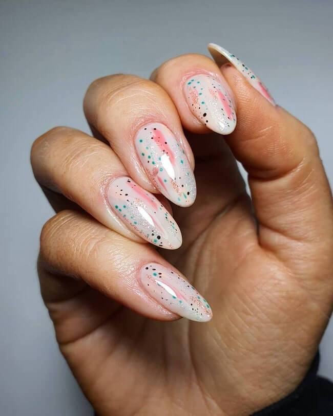 Сплошной нюд можно разбавить блестками и тонкой полоской цветного лака.
