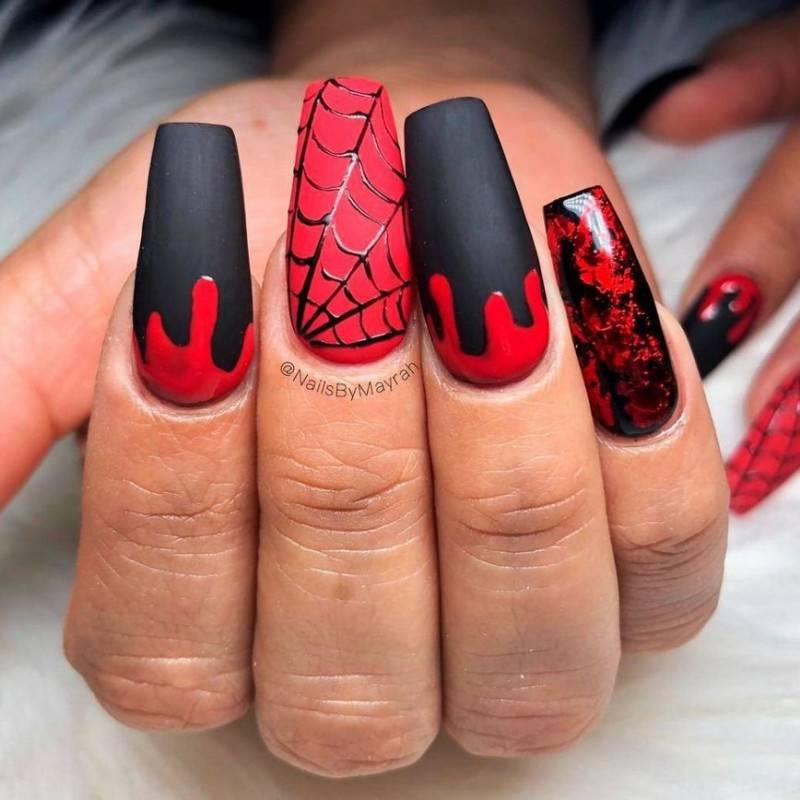 Большая площадь длинных ногтей позволяет воплотить в жизнь самые смелые идеи чёрно-красного маникюра. Кроме узоров и рисунков, пластину в форме «миндаль», «мягкий квадрат» можно покрыть кружками-камифубуки, шариками-бульонками, нанести втирку, фольгу, использовать эффект «битого стекла», «кошачьего глаза».