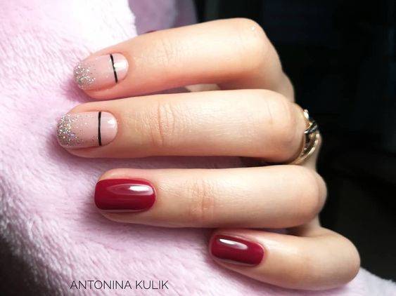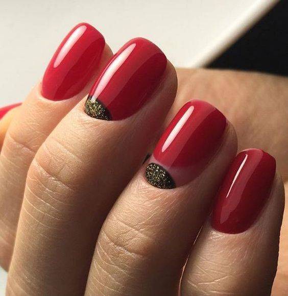 Золотой цвет и черно-красный маникюр создают эффектный и роскошный образ. Для этого можно использовать золотые блестки, полоски или акцентировать один или два ногтя золотым цветом.