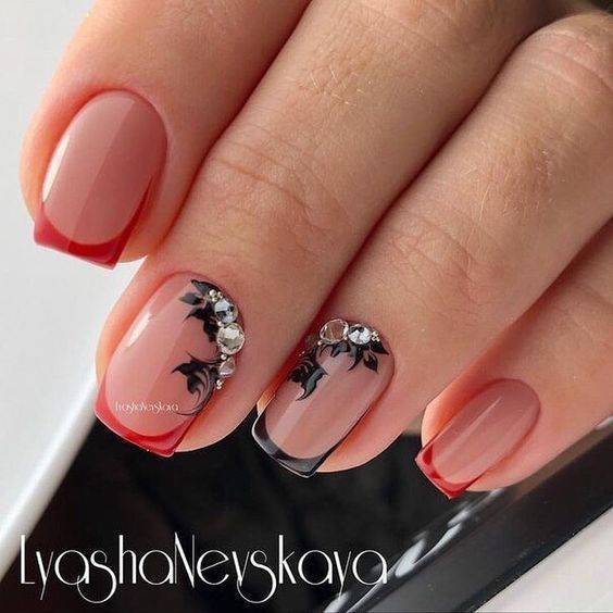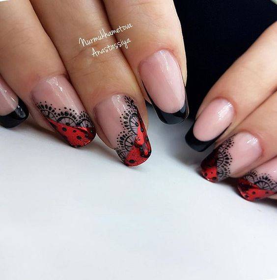 Существует невероятное количество различных идей для создания французского маникюра, ведь в каждом сезоне мастера предлагают девушкам новые идеи для выбора красивых дизайнов для себя. Сегодня резко возрос интерес к обратному французскому маникюру, особенно если улыбка выполнена в черном цвете, а остальная часть покрыта красным тоном. В качестве дополнения используйте нежное кружево или другие узоры. Еще один стильный французский маникюр в этих тонах — прекрасное негативное пространство. При выполнении такого маникюра низ ногтя делается красным, а незакрашенное пространство может быть ниже или выше ногтевой пластины. Прозрачную зону можно украсить черными рисунками или выделить линиями с двух сторон.
