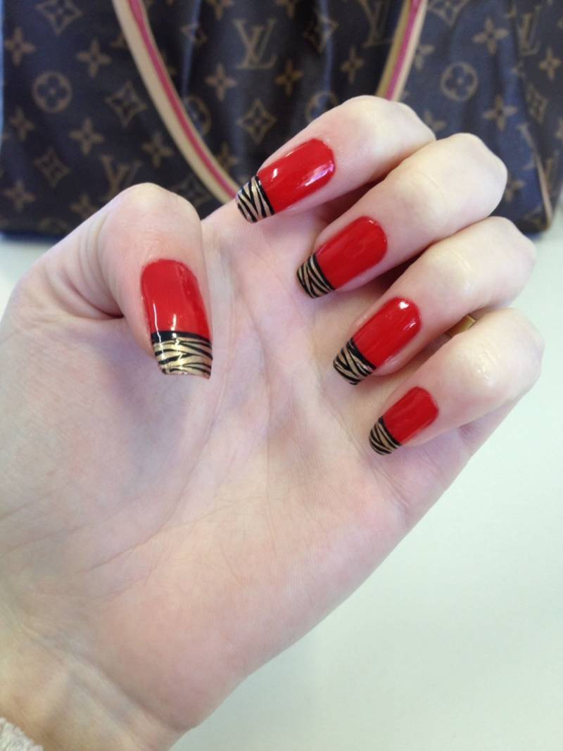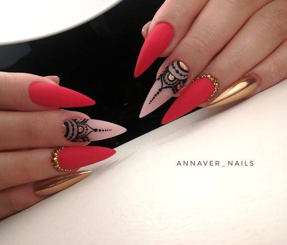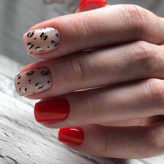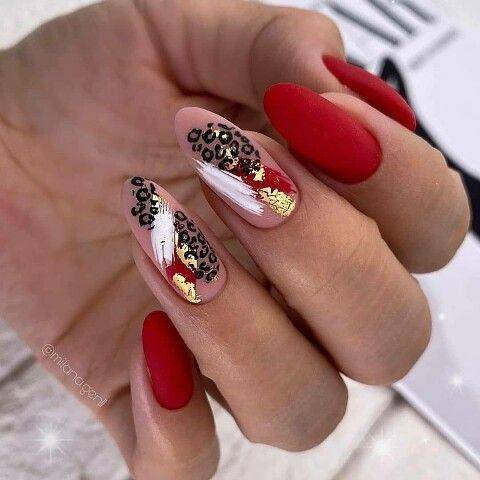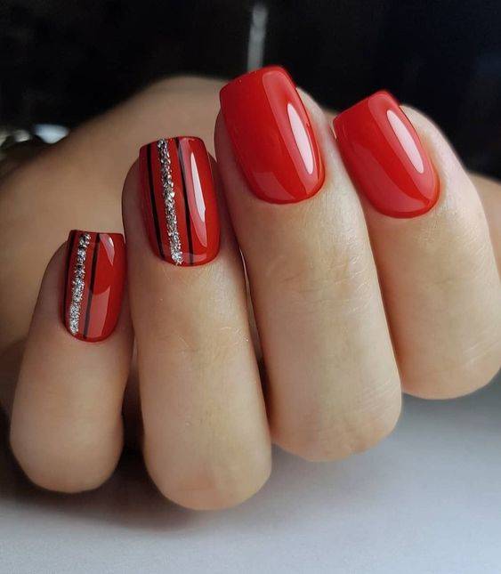 - Под красным глянцем и матовым покрытием стильно смотрится дизайн с фольгой.