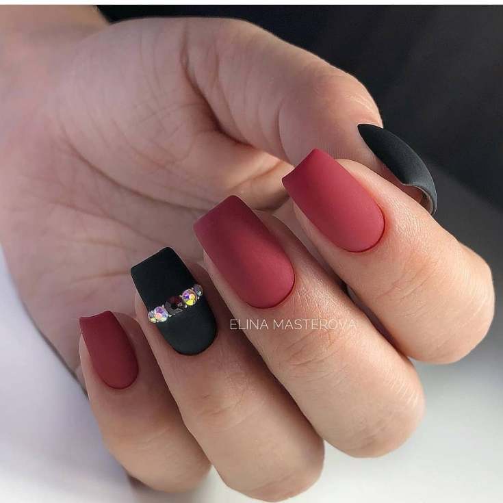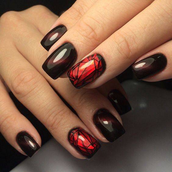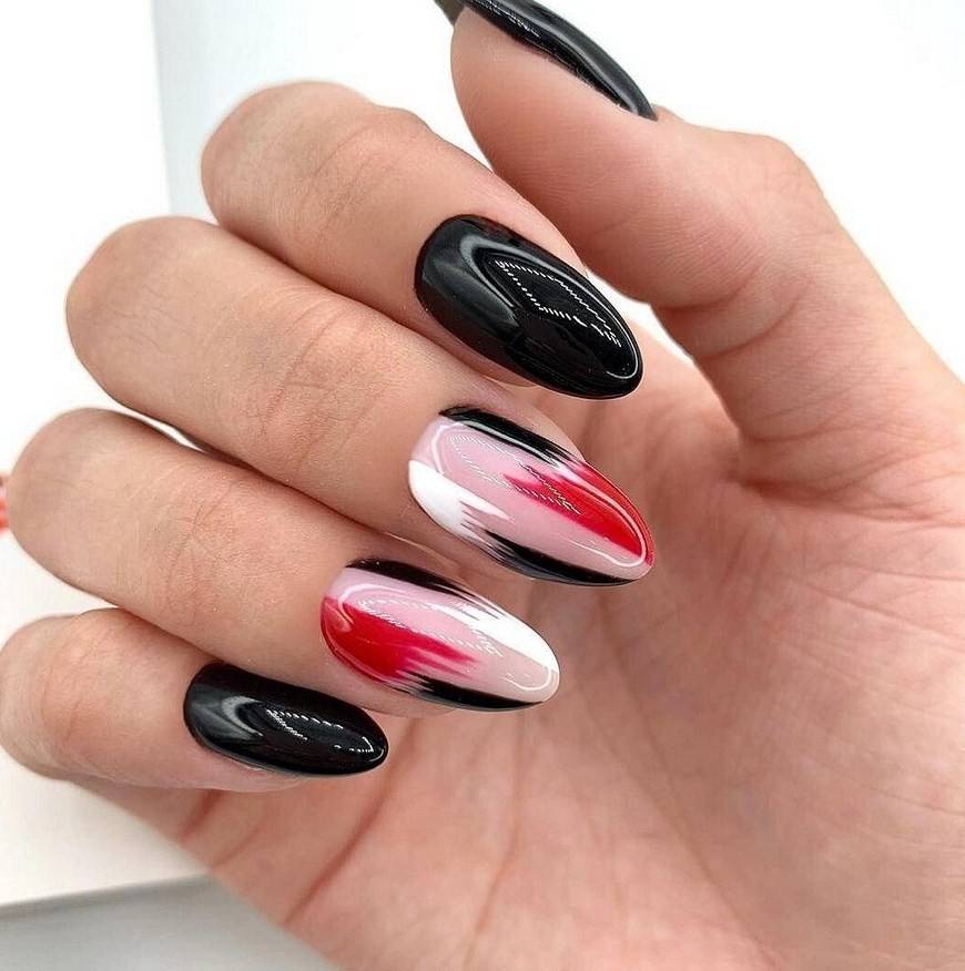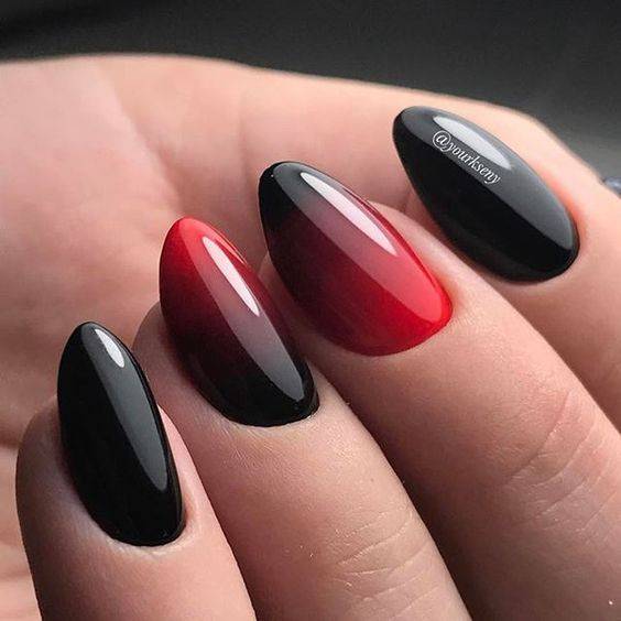 Сочетание двух базовых цветов черного и красного с градиентным плавным переходом одного в другой может использоваться в таких вариантах покрытия ногтей: