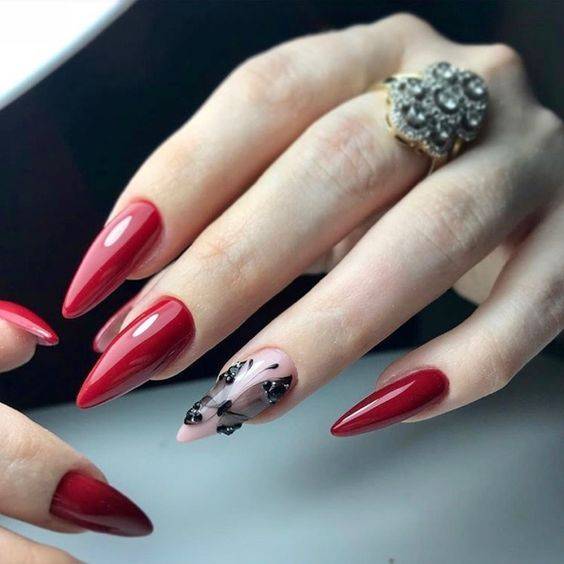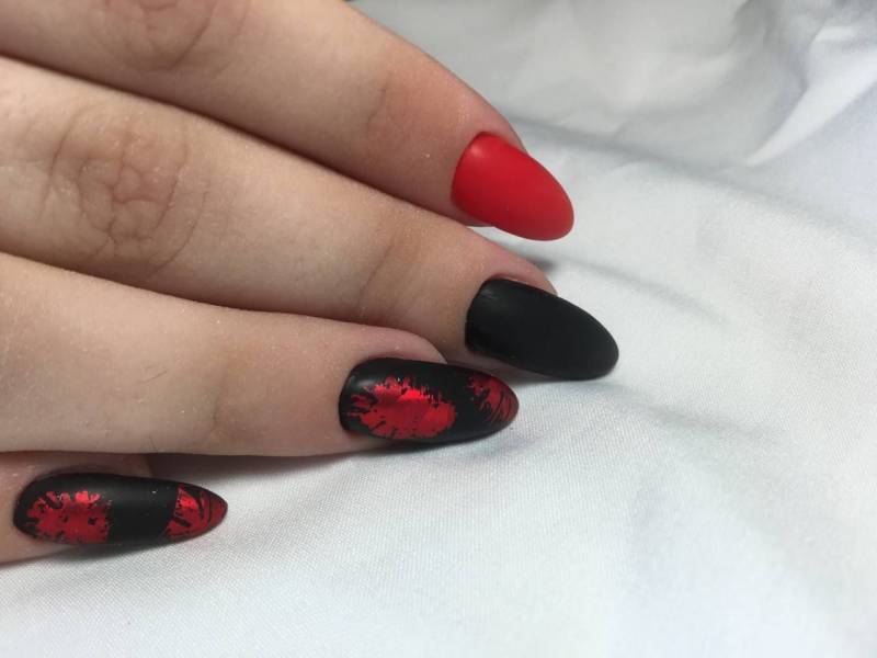 Большая площадь длинных ногтей позволяет воплотить в жизнь самые смелые идеи чёрно-красного маникюра. Кроме узоров и рисунков, пластину в форме «миндаль», «мягкий квадрат» можно покрыть кружками-камифубуки, шариками-бульонками, нанести втирку, фольгу, использовать эффект «битого стекла», «кошачьего глаза».