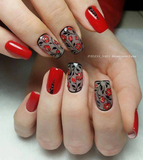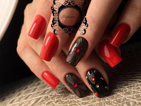 На фото дизайна черного с красным маникюра часто можно увидеть узоры, роспись или же другие варианты декорирования. Украсить ноготки можно бесконечным множеством вариантов! Рассмотрим самые популярные и творческие идеи.