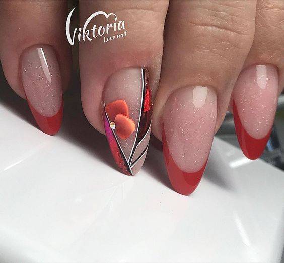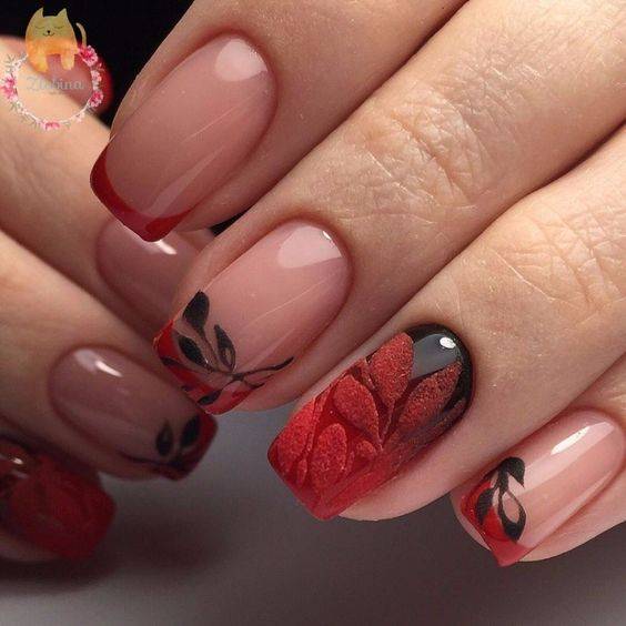 Восхитительный и утонченный красно-черный французский маникюр требует особого дополнения. Таким элементом могут стать рисунки. Для этого цветового сочетания тонко подходят геометрические мотивы разной формы. Мастера нейл-арта предлагают делать линии на красном тоне черным цветом. Для романтичных и нежных девушек подойдут цветочные и цветочные мотивы, способные дополнить образ легкостью и мечтательностью. Для выполнения строгого офисного дизайна используется геометрия. А для более замысловатого эффекта можно изобразить световые узоры.