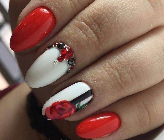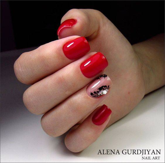 Один ноготок полностью покрывается крупными стразами, а несколько пальчиков украшается небольшими узорами. Для красного маникюра подходят стразы в золоте, серебре, на контрасте – черные и как парный цвет – красные.