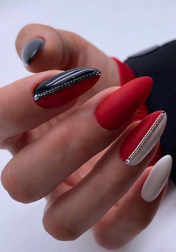 Черно-красный маникюр с белыми элементами — это классический вариант, который всегда выглядит стильно и элегантно. На черно-красном фоне белые полосы, точки или рисунки будут хорошо контрастировать и выгодно подчеркнут ваш маникюр.