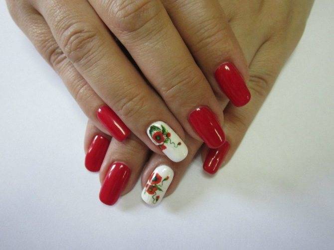 Оформление ногтей рисунками относится к художественной и трафаретной технике. Красная основа без глянцевого сияния идеально для этого подходит.