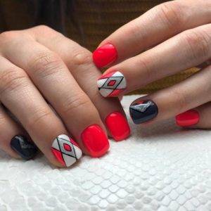 Геометрия в черно-красном альянсе. Маникюр алого цвета с глянцевыми геометрическими полосами смотрится очень достойно и стильно. Можно расположить их хаотично, выстроить в одну сторону или же сделать красивый рисунок с помощью прямых линий – как душа того пожелает. Отличным помощником в создании геометрических узоров станет также модный в этом сезоне гель-паутинка, он сделает линии идеально ровными и четкими.
