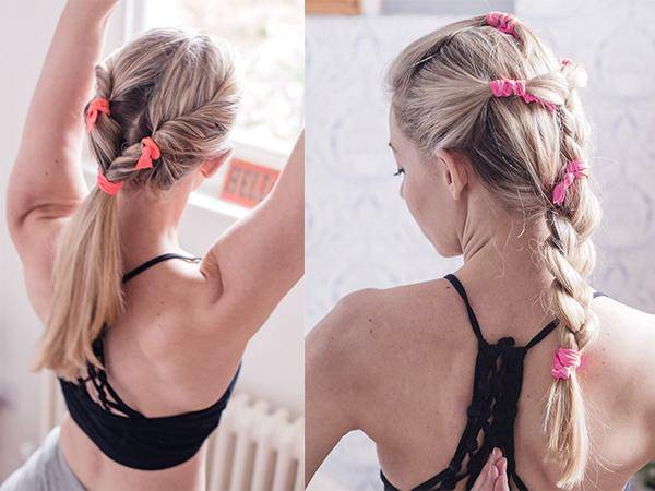 Нет ничего проще, чем вспомнить детство и заплести косичку колосок. Прическа соберет все волосы от лица, и не будет мешаться во время тренировок. Для ее фиксации потребуется одна резинка и заколки, если появятся выбившиеся прядки.