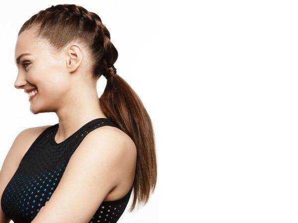 - Обычная коса — самый быстрый и удобный способ создания прически для длинных волос. Она отлично держится если волосы одинаковы по длине и туго заплетены. На каскадных стрижках, при интенсивной тренировке, коса может стать неопрятной. Если вы боитесь, что челка будут мешать во время тренировки, наденьте спортивную повязку, которая сохранит ваши волосы даже при интенсивных и внезапных движениях. Такая повязка пригодится и во время пробежек в холодные дни — это защитит ваши уши от холода.