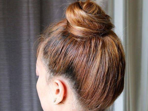 - Чтобы сделать пучок, соберите волосы на затылке, скрутите их, сформируйте узел и закрепите результат шпильками или длинной заколкой.