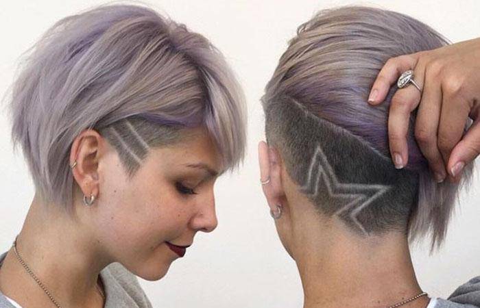Эффектно смотрятся прически, совмещающие андеркат и hair tattoo (о об этом чуть ниже), – когда на выбритой части головы сделаны узоры (полоски, звезды, символы).
