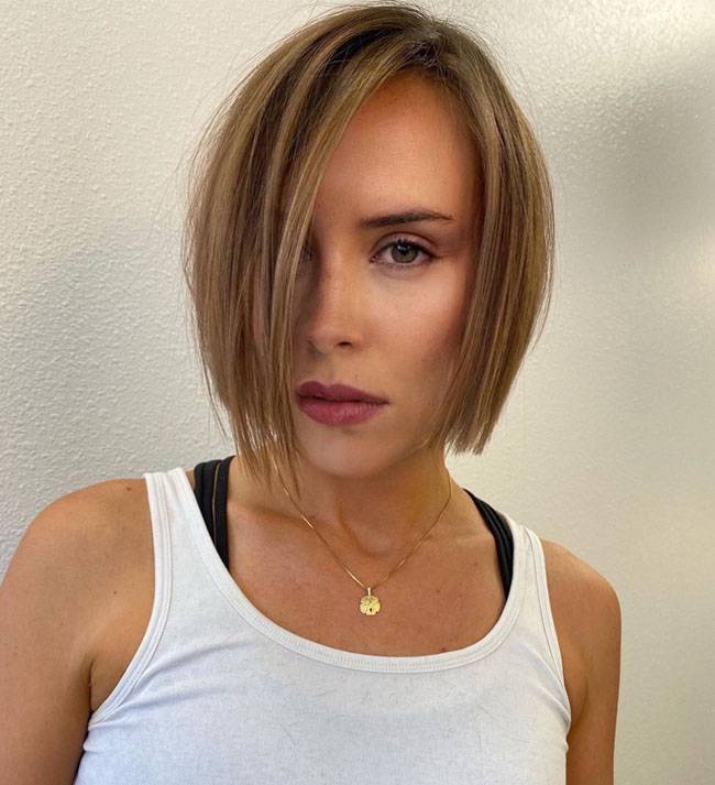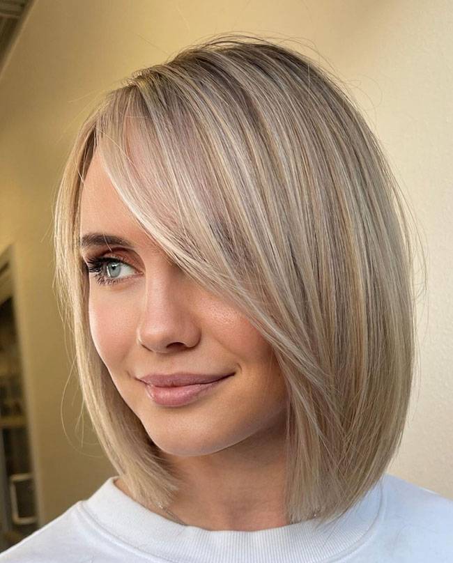 Нужно сделать так, чтобы ваше лицо выглядело немного короче и полнее. Самой эффективной длиной для вас всегда будет длина до подбородка. Вы можете добавить сюда асимметрию или косую челку.