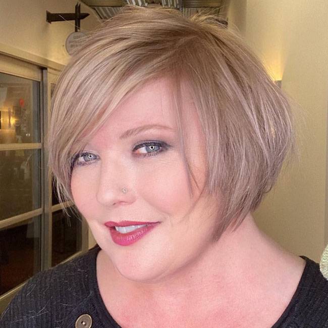 - Крупным пышкам идут объёмные причёски. Это боб, удлинённое каре, а также асимметричные варианты.