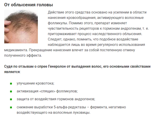«Генеролон» – эффективный препарат для предотвращения облысения в области лба и на макушке мужчин. Наносится только на здоровую кожу и сухие волосы. Не требует смывания. Для лечения используется 5% раствор. Первые признаки роста можно заметить после 2-3месяцев применения. Распыляется 2 раза в день. В некоторых случаях курс лечения составляет до 12 месяцев.