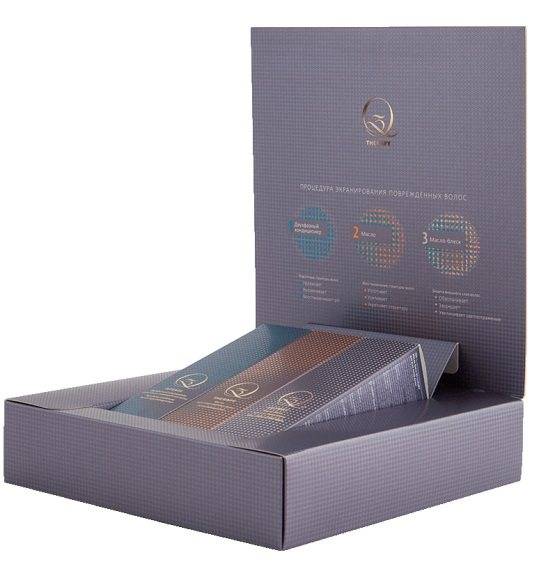 - Q3 Therapy — комплекс гидролизированных масел — арганы, виноградных косточек, макадамии, а также силикона. Это средство покрывает каждый волосок дышащей микропленкой, обладает защитными свойствами от вредного УФ-излучения.
