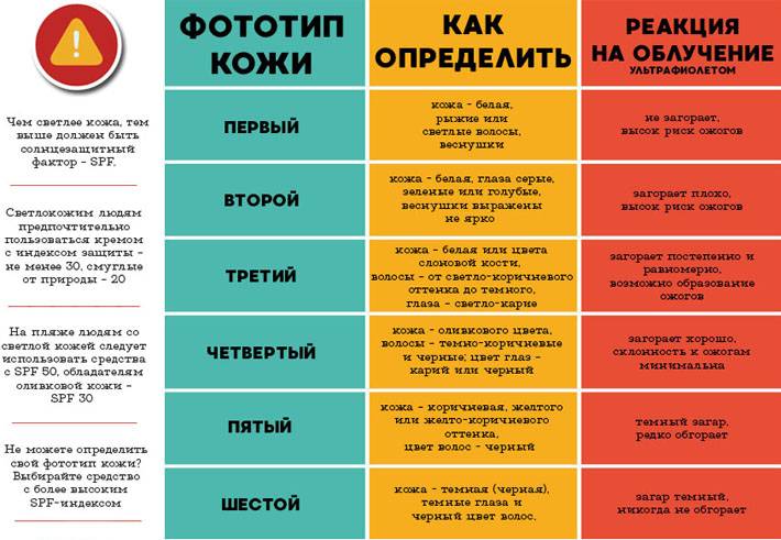 Кожа каждого человека принадлежит к определенному фототипу, по которому определяется переносимость солнечных лучей, а также скорость и интенсивность загара: