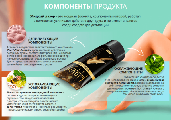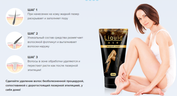 Натуральный и безопасный состав крема безболезненно и надолго удаляет нежелательные волоски. Метод отлично заменяет восковую эпиляцию. С каждым последующим сеансом рост замедляется. Накопительное действие крема делает кожу гладкой, растущие волоски становятся тонкими и практически незаметными. «Жидкий» лазер работает на волосе любой длины. При этом совершенно не ощущается дискомфорта во время манипуляций. Активные вещества средства имеют свойство проникать в глубокие слои кожи и разрушать строение фолликула. Такое воздействие не допускает появление врастающих волос, не остаются черные пеньки.