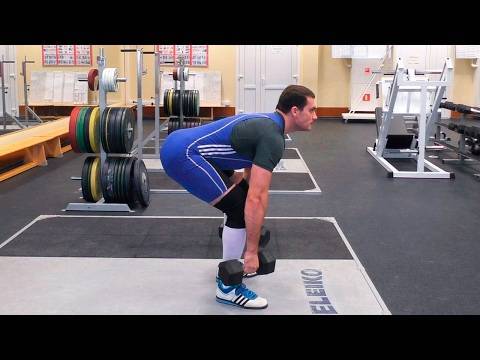 - Гантели лежат на полу, срыв выполняется за счет ног. Грифы захватываются обеими руками, затем атлет отталкивается ногами, и срывает гантели с помоста;