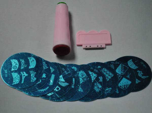 В наборе имеется пять дисков с 5-7 изображениями на каждом, скребок без зазубрин и острых концов, удобный штамп. Также в составе наличествуют три лака, имеющие повышенную густоту.