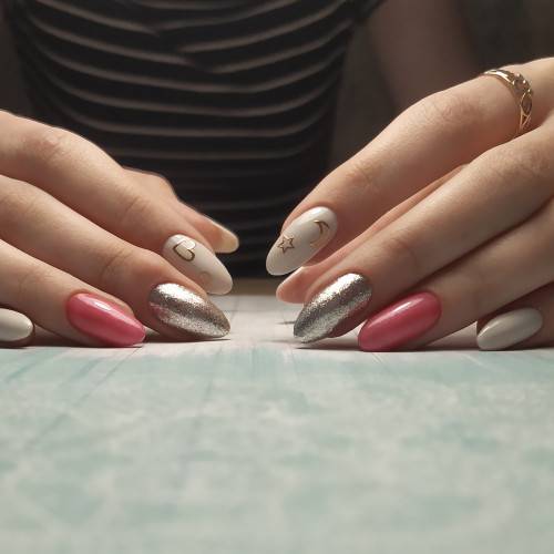 Для нюдового дизайна с глянцем используется декор из золота и серебра, яркие и матовые блестки, технику нанесения лака с градиентом и переходами.