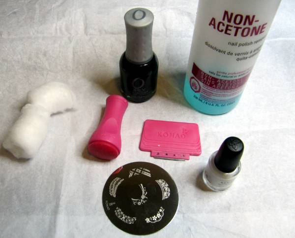 Техника подобного декорирования ногтей подразумевает применение специальных лаков и красок, на флаконах которых есть пометка «для стемпинга». Теоретически для создания штампованных рисунков можно использовать обычный лак для ногтей, только он должен иметь высокую концентрацию красящих пигментов. Чтобы проверить степень пигментации, следует нанести отпечаток на чёрный фон. Необходимо учитывать, что есть быстросохнущие лаки и краски, применение которых требует от мастера оперативности. Если упустить момент, то лак может высохнуть ещё в трафарете.