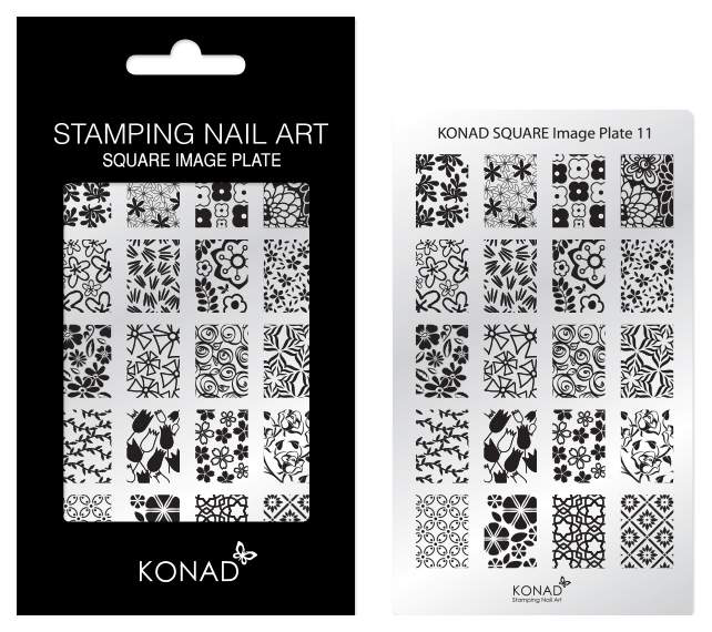 - Пластины. Материал представляет собой металлическую плитку круглой, квадратной или прямоугольной формы. На нее нанесено от 6 до 12 оттисков. Стоимость пластины зависит от ее размера, качества металла, равномерности линий узора. Слишком глубокие тиснения трудно заполнить густой краской для стемпинга. Поэтому на ногте могут оставаться белые пятна-пустоты. Напротив, мелкий оттиск способствует чрезвычайно быстрому застыванию лака, требует спешки при перенесении узора.
