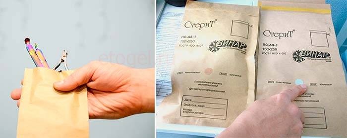 Предназначенный для длительного хранения инвентарь запечатывают в крафт пакет перед тем, как поместить его в стерилизатор. Крафт пакеты для стерилизации при запечатывании скрепками обеспечивают трехдневную стерильность. В заклеенном крафт пакете инструмент остается стерильным в течение 20 дней, в термосваренном – до 30 дней.