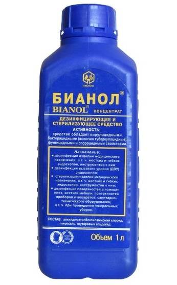 Бианол — это светло-голубая жидкость, состоящая из глутарового альдегида, алкидиметилбензиламмонийхлорида, глиоксаля и вспомогательных веществ. Для дезинфекции используется 2% раствор. Его готовят из 20 мл концентрата и 980 мл воды. Первый компонент перед разбавлением необходимо перемешать. Процедура дезинфекции должна занять 15-20 минут.
