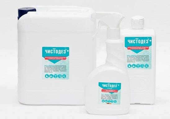 Чистодез содержит комплекс ЧАС, ПГМГ, ПАВ, антикоррозионные компоненты, то есть действует несколько иначе, чем предыдущее средство. Действует на грамотрицательные и грамположительные бактерии, почти все известные вирусы, грибки. Для дезинфекции используйте растворы: