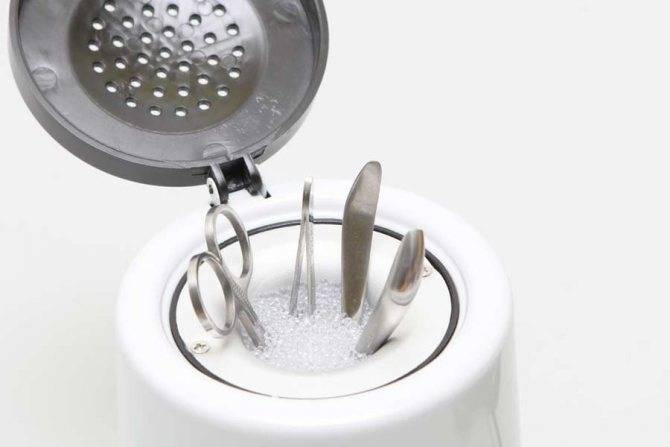 Благодаря кварцевым шарикам, которые могут плавиться только при самых высоких температурах, он может нагреваться до 240 ºС. До стерилизации нужно заранее включить прибор на полчаса, чтобы он нагрелся, а затем на 30 минут заложить в него инструменты. Процедура проводится только для металлических предметов.