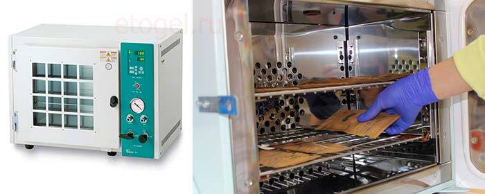 «Золотой стандарт» стерилизации. Работает по аналогии с духовкой – термически обрабатывает помещенные в него инструменты. Для стерилизации используют температурный режим в диапазоне 180-260 градусов.
