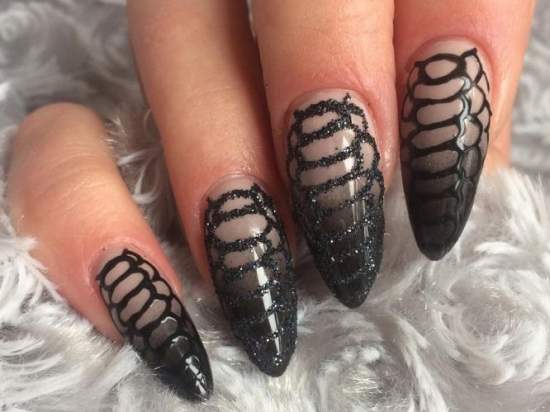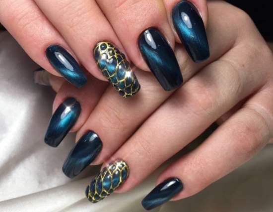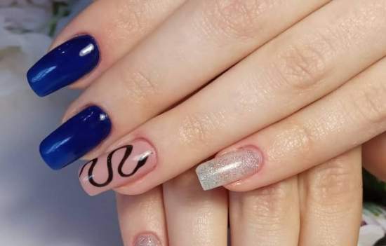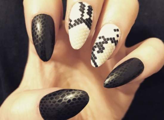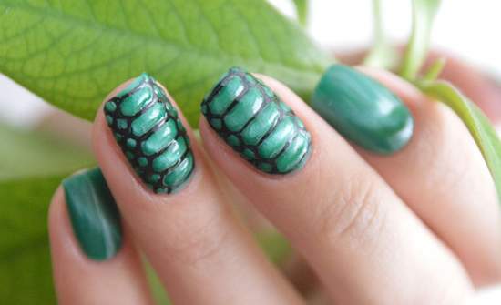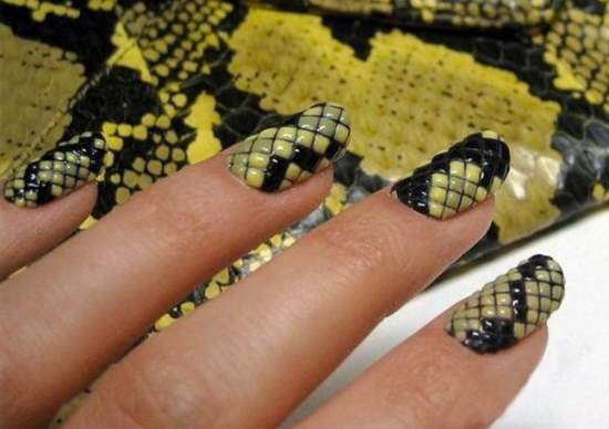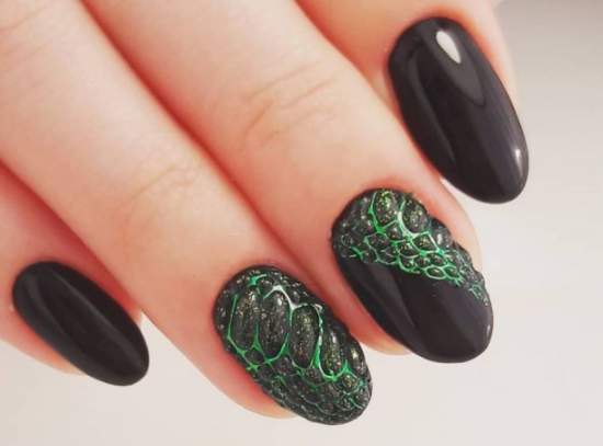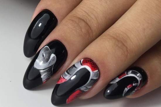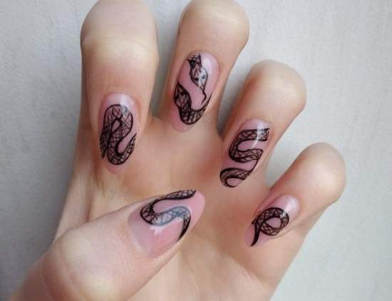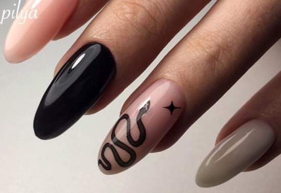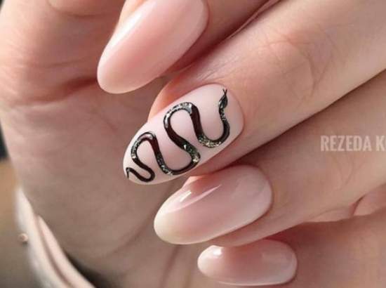 Интересный дизайн можно выполнить с помощью черного гель-лака. Его наносят на все ногти одной руки, а на второй черным цветом рисуют змею. В качестве фона для рисунка лучше использовать нюдовые оттенки или яркие, контрастирующие с черным покрытием цвета: желтый, красный, оранжевый. В зависимости от того, какой цвет будет выбран для ногтей с рисунком, можно получить либо спокойный маникюр для повседневной носки, либо яркий и эффектный дизайн.