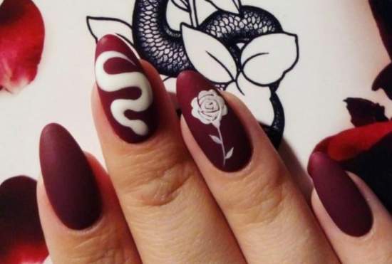 Черная змейка может украсить красный монохромный маникюр, при этом не сделав его вычурным или слишком вульгарным. Очень стильно такой маникюр будет выглядеть под матовым топом.