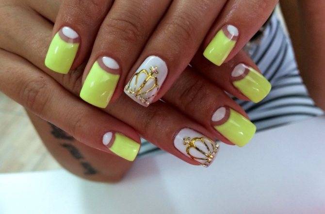 Современная девушка старается выделить себя из серой массы остальных женщин и потому старается сделать максимально шикарный и вызывающий маникюр, но который вряд ли решаться ее знакомые. В настоящий момент на пике популярности находится такой маникюр, где стазы украшают ногти в виде короны. Лучше всего делать его на одном определенном ногте, чтобы не «перегрузить» пальцы.