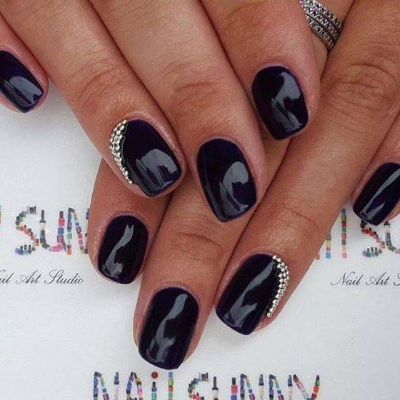 Для усиления эффекта экстравагантности и таинственности подойдут металлические камешки. Они могут иметь форму бусинки и капельки, треугольника и ромба, круга и овала. Сочетать такое великолепие можно и на глянцевой и на матовой поверхности.