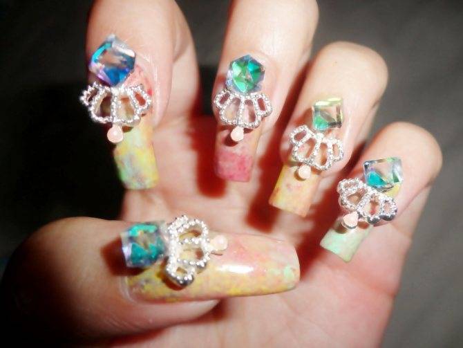 Подмечено, что украшения надежнее сохраняются на нарощенных ногтях, а также — при выполнении дизайна специальными составами, например, как при создания эффекта жидких камней.