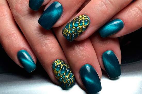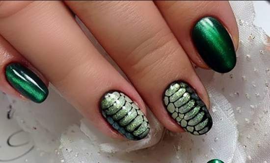 Темно-зеленый гель-лак часто выбирают для осеннего маникюра. Особенно красиво смотрится такое покрытие под матовым топом. Дополнить дизайн можно с помощью силуэта змейки, нарисованного тонкой кистью и черной гель-краской.