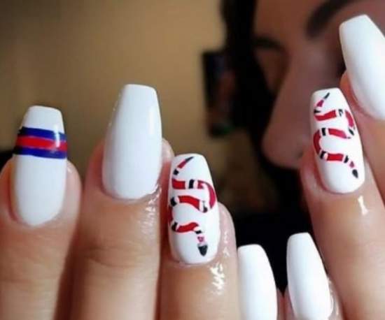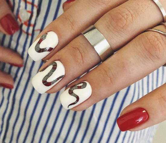 Выразительно выглядит змея на белом фоне. Если в качестве основного цвета маникюра выбрать белый, для изображения змеи можно использовать любые цвета красок, даже очень яркие, такие как оранжевый, желтый, красный. Чтобы уравновесить композицию, можно покрыть несколько ноготков гель-лаком одного из цветов, используемых в рисунке.