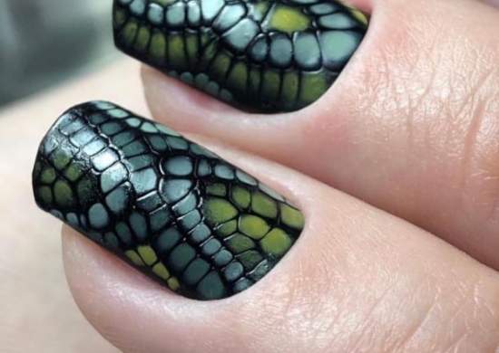 Для маникюра со змеиным рисунком можно использовать любые цветовые решения. Наиболее выигрышно в таком дизайне смотрятся цвета, которые встречаются в природной окраске рептилий: коричневый, зеленый, синий, песочный. Для повседневного маникюра можно использовать 2 – 3 оттенка покрытия, например, трио «бежевый, коричневый и белый», «синий, голубой и черный».