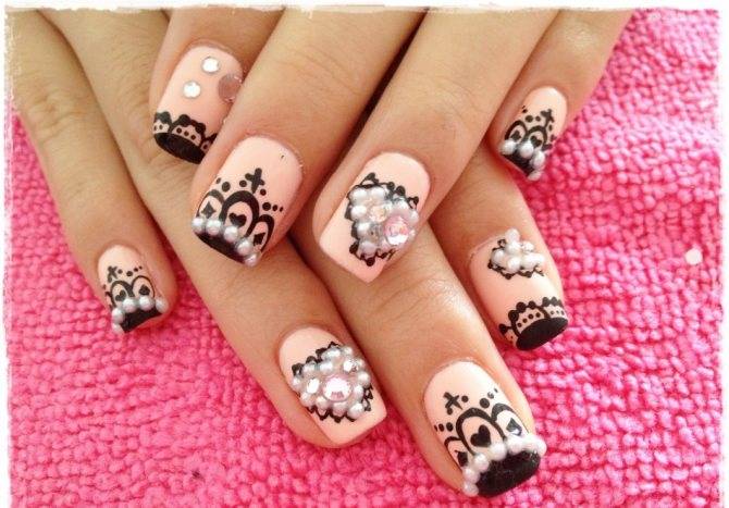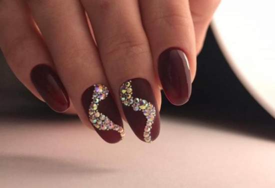 - когда лак прозрачный, матовый, оттенок спокойный, то можно украсить стразами различного оттенка, такое сочетание считается приемлемым;