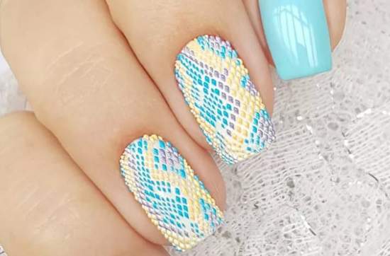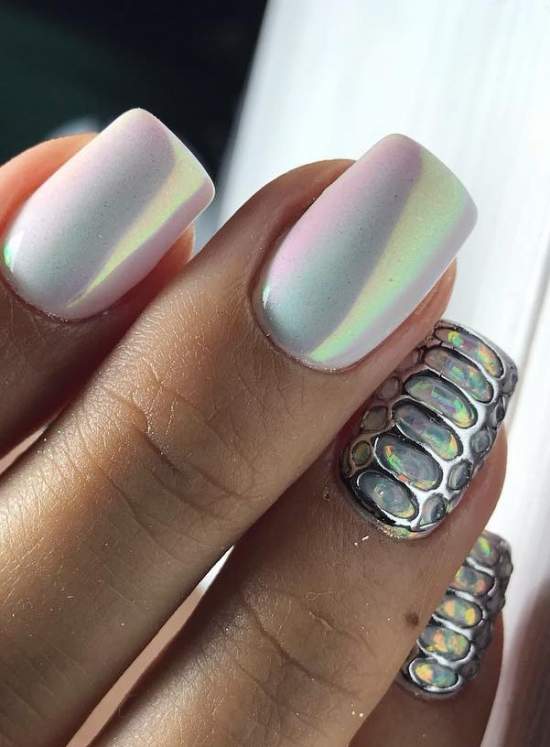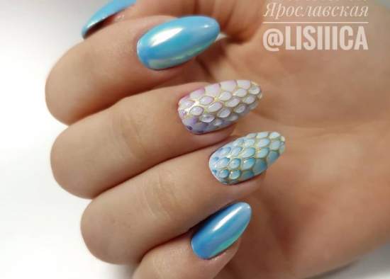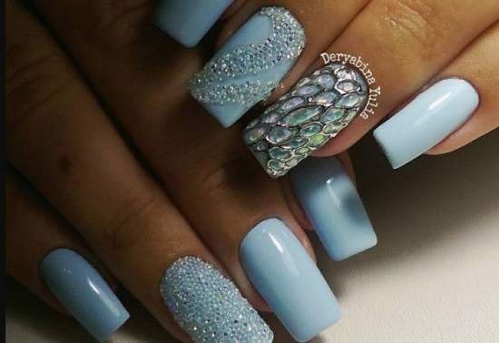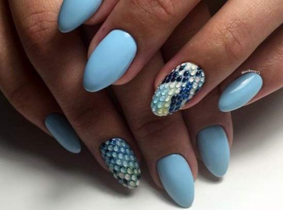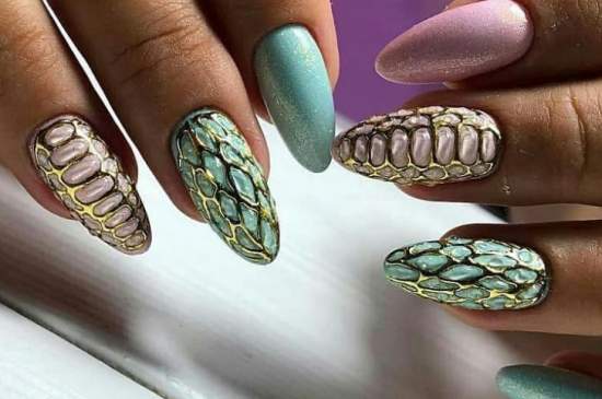 На светло-голубом фоне красиво смотрится змеиная чешуя синего цвета. Такой дизайн не будет слишком ярким и подойдет на каждый день. Светло-голубой маникюр можно дополнить рисунком змеиной кожи в белом цвете. Такой нейл-арт получится еще более нежным. Рисунок также можно создать в акварельной технике или нанести с помощью аэрографа.